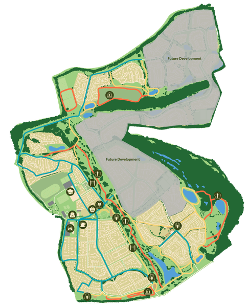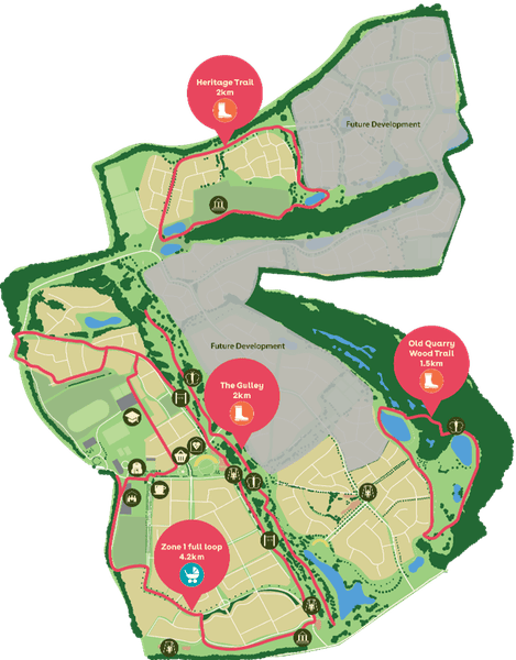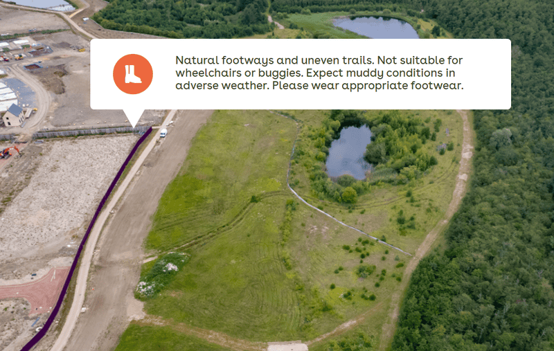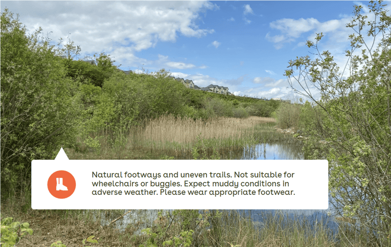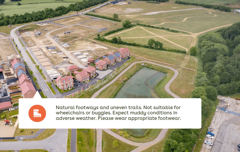 We’ve highlighted some of our favourite routes and loops around the development. Some of these routes are made up of natural footways and uneven trails – and are not suitable for wheelchairs or buggies. You should expect muddy conditions in adverse weather, so please wear appropriate footwear!