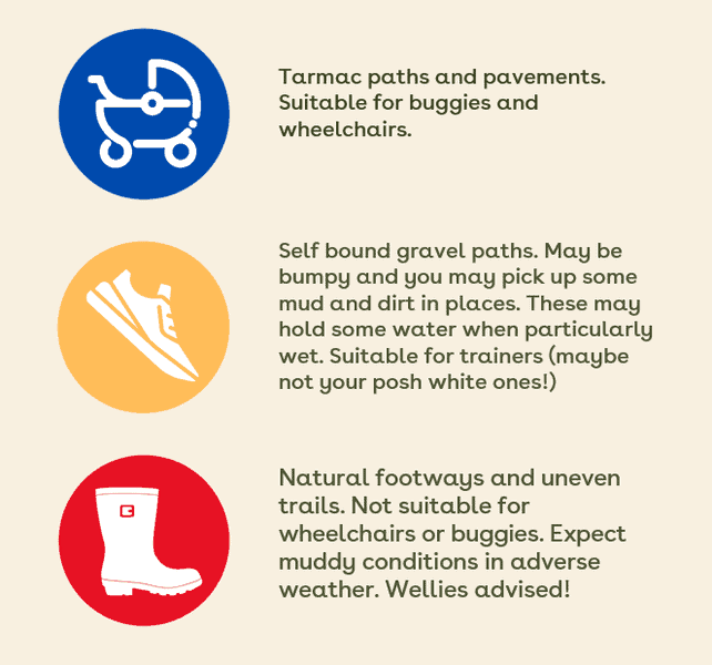 There are many different routes to walk around Priors Hall Park, with different types of terrain for different experiences and seasons. This map shows some of the routes available, with a key showing what you can expect from the ground conditions.